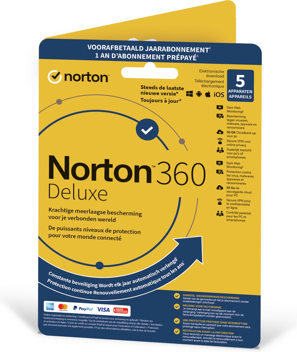 Norton 360 Deluxe 2023 bevat alles wat je nodig hebt om je online leven te beschermen. Met deze software bescherm je tot 5 apparaten tegen malware, phishing en ransomware. Je kunt je wachtwoorden, creditcardgegevens en andere gegevens online versleutelen in je eigen safe in de cloud. Belangrijke bestanden en documenten worden bewaard als een preventieve maatregel tegen gegevensverlies door schijfdefecten, diefstal van apparaten en zelfs ransomware. Daarnaast krijg je 50 GB cloudback-up voor pc. Met de Slimme firewall voorkom je ongeoorloofd verkeer dat met je computer probeert te communiceren. En met Secure VPN voorkom je ongeoorloofde toegang tot je webcam. Norton SafeCam waarschuwt je bij elke toegangspoging tot je webcam. Ten slotte is er ook Ouderlijk toezicht, waarmee je je kinderen veiliger laat surfen. Met deze Norton 360 Deluxe 2023 ben je de hele dag door beschermd tegen online bedreigingen.